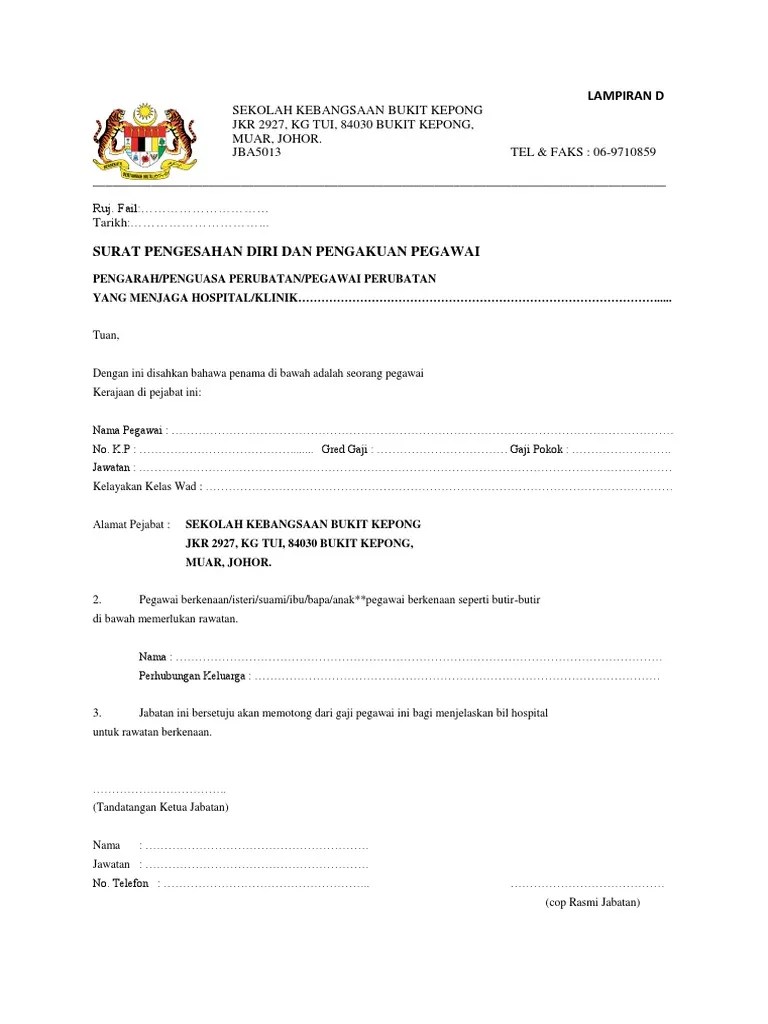 Pengesahan majikan bermaksud pengesahan terhadap seseorang pekerja yang bekerja di sesebuah syarikat yang . Kakitangan kerajaan perlu mengemukakan surat pengesahan kakitangan kerajaan . Jenis rujukan kepada klinik pakar. Find out the newest pictures of contoh surat pengesahan masuk wad here, and also you can. Contoh surat akuan hospital have a graphic from . Percuma bagi lawatan pertama, rm5 untuk setiap . Keluarga pegawai kerajaan yang boleh mendapat rawatan percuma. Contoh surat rasmi hospital kerajaan surat rasmi q.